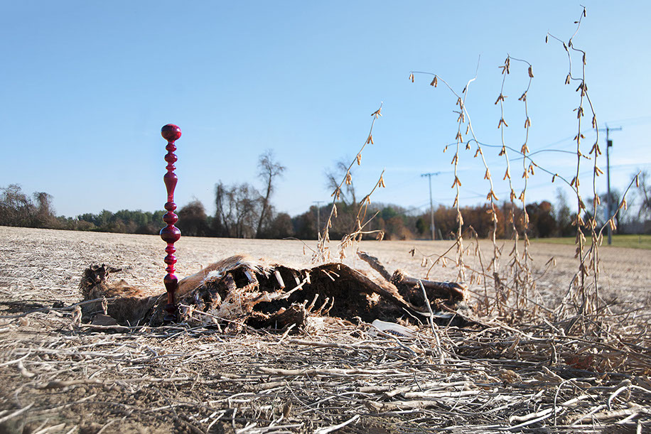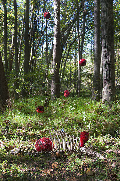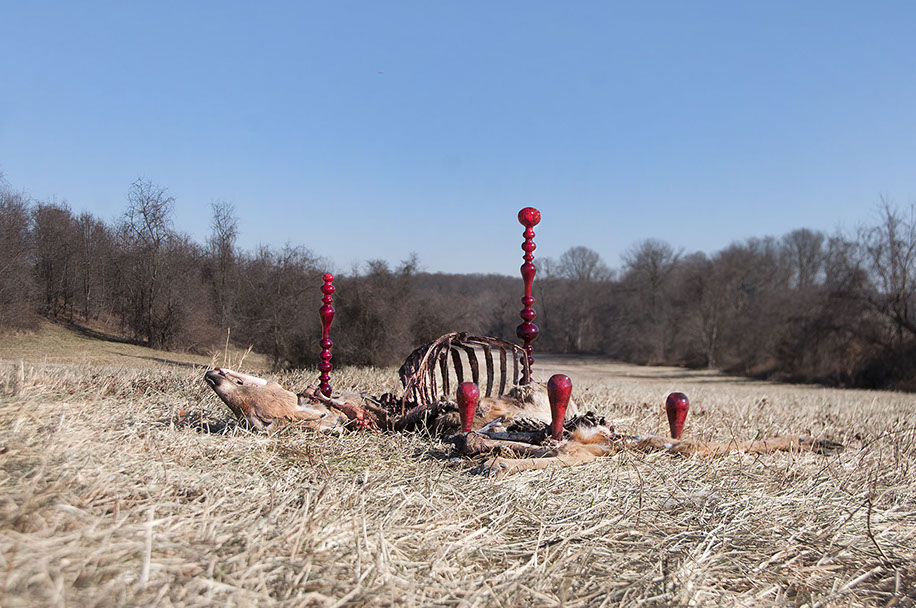 deer skeleton, glass, steak, blood, monofilament and spray paint