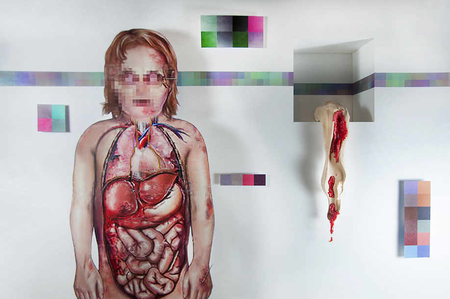 anatomy model, inkjets on paper mache tube with blood